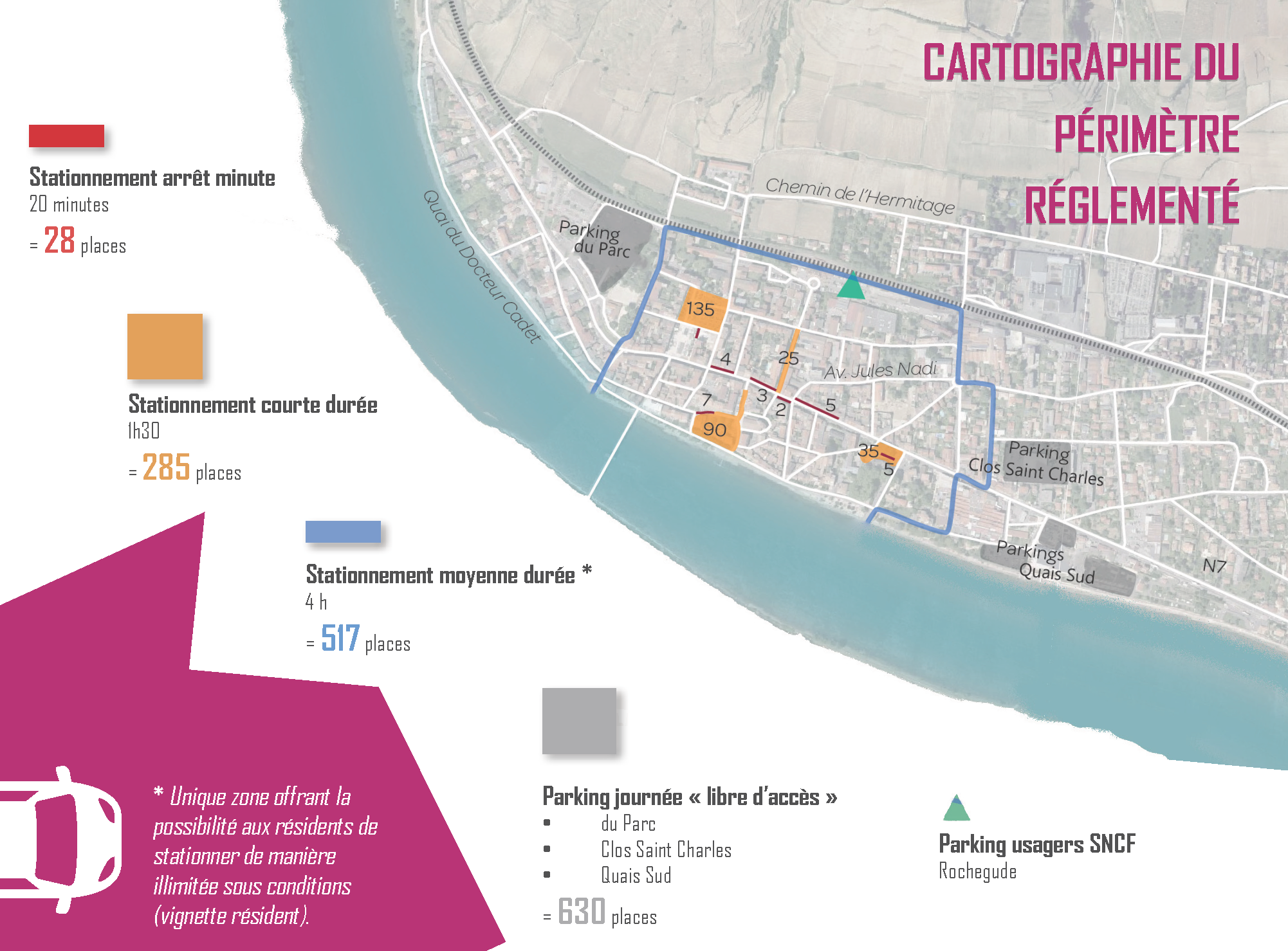 Le stationnement dans la ville de Tain l'Hermitage est gratuit, les places disponibles sont limitées selon trois durées :
